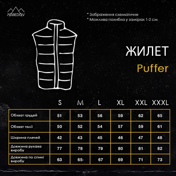 Жилет повсякденного стилю з прямим кроєм, без капюшона. Оснащено трьома кишенями: двома боковими на блискавці для рук і однією потаємною кишенею на блискавці. Наповнювач — пух, а внутрішня підкладка з поліестеру. Низ виробу регулюється за допомогою резинки та фіксаторів. Температурний режим від +10 до -5 °C.